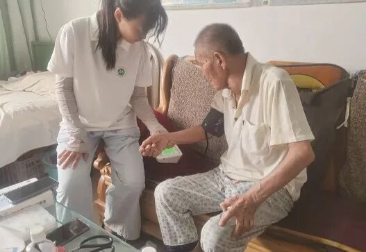 图为实践团入户为居民测量血压,血糖
