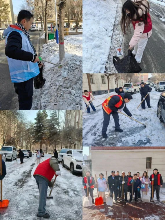 志愿者们化身环境“美容师”与出行“守护者”,一方面手持垃圾夹、垃圾袋,细致捡拾路面、绿化带及积雪中的垃圾杂物,彻底清理卫生死角;另一方面挥动铁锹、推雪铲,合力清除社区道路积雪积冰,消除出行安全隐患,用双手擦亮社区“颜值”,为居民营造干净整洁、安全有序的生活环境。