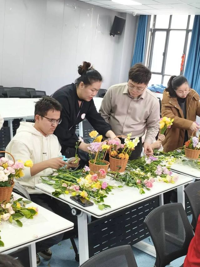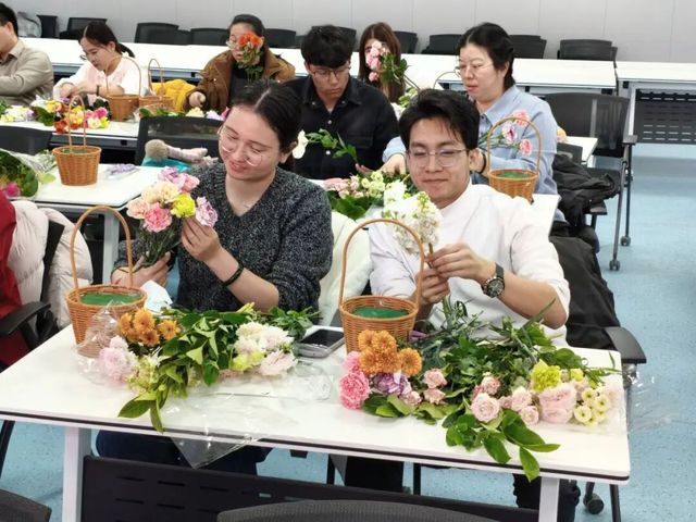随后,花艺沙龙活动正式拉开帷幕。系办特别邀请两名专业花艺师现场授课,从花材识别、色彩搭配、造型设计等方面进行细致讲解,并示范错落有致的插花技巧。在花艺师的指导下,师生们巧手修剪、精心构思,或组队合作,或互相切磋,将一朵朵鲜花组合成独具匠心的花艺作品。活动现场花香弥漫,欢声不断,大家边创作边交流,在轻松愉悦的氛围中拉近了彼此的距离。